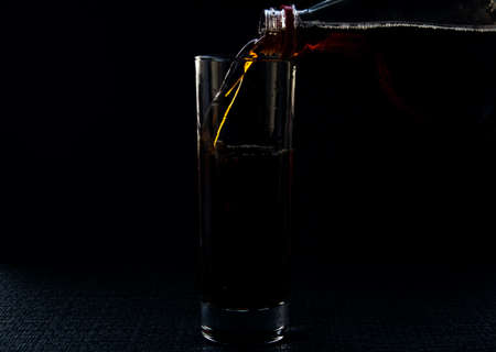 Darkened photo of a glass with a pouring soda.