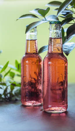 Kaliningrad, Russia - June, 2021 - Bottles with cold pink lemonade and glass with ice, green background with leaves. Summer refreshing drink. Selective focus.