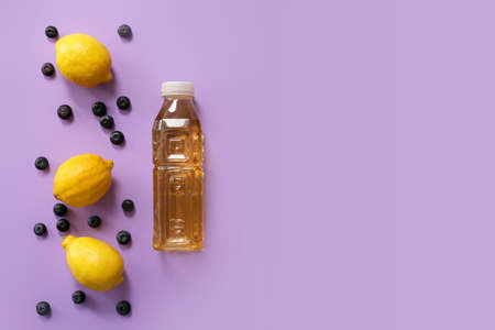 Bottle of fresh ice tea and ingredients on color background