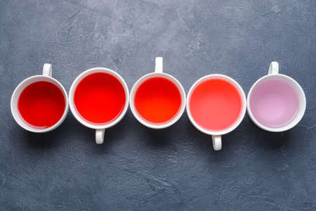 Cups with different types of hot tea on dark background
