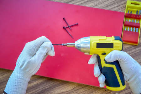 Screwing a screw into a board with a cordless screwdriver, assembling furniture, DIY repair