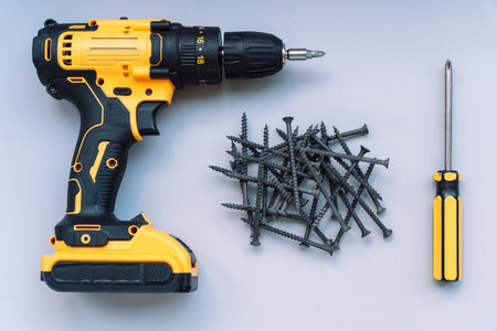 Yellow wood screws, electric drill and wooden table