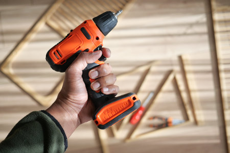 Man hand holding electric screwdriver and screwing screw in the wooden furniture box. close up shot, DIY