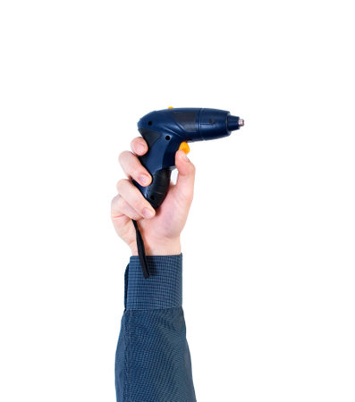 A man's arm raised holding an electric screwdriver isolated on white background