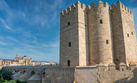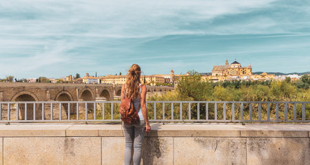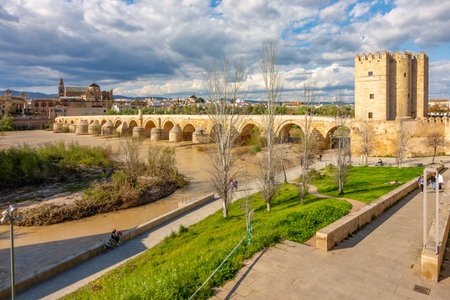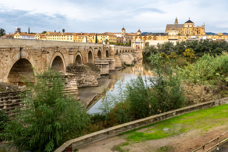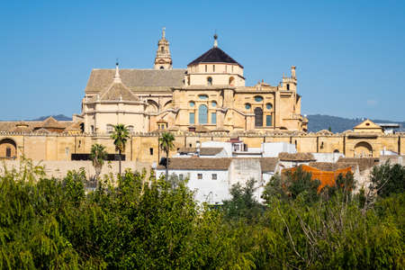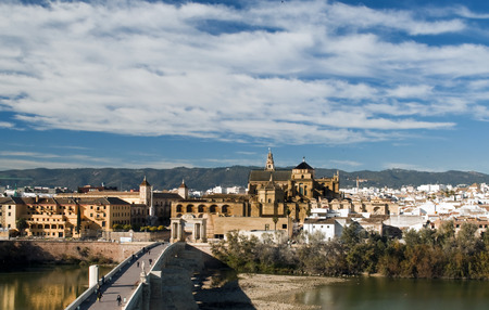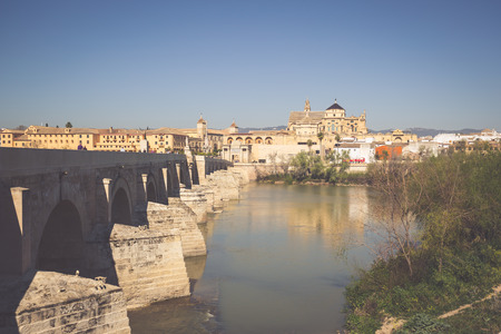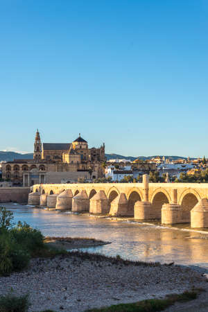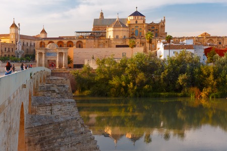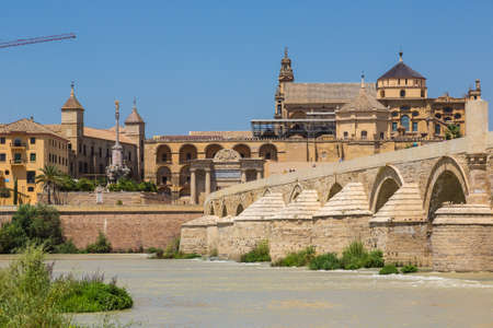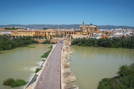 CORDOBA, SPAIN - JUNE 27, 2016: The Great Mosque (Mezquita Cathedral) and Roman Bridge on Guadalquivir river in Cordoba in a beautiful summer day, Spain