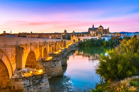 Evening view of the Mosque-Cathedral and Roman Bridge in Cordoba, Spain