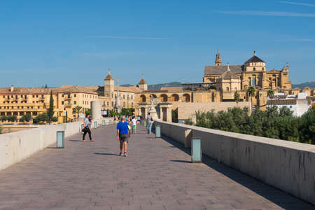 Cordoba, Spain-august 11, 2017: people on the old roman bridge that crosses the Guadalquivir River and the cathedral during a sunny day.