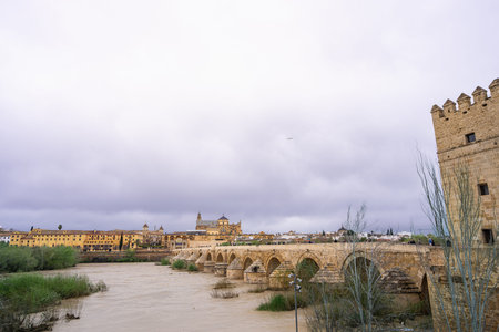 Ancient Roman Bridge across the river Guadalquivir in Cordoba. Cordoba Mosque and Cathedral is in the background. This bridge was featured in TV series Game of Thrones as the Long Bridge of Volantis.
