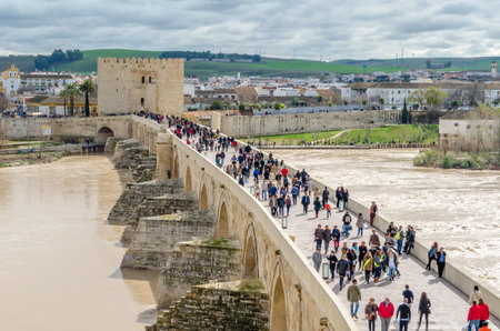 CORDOBA, SPAIN - FEBRUARY 16, 2014: People crossing the ancient Roman stone bridge of Cordoba, Andalusia, Spain
