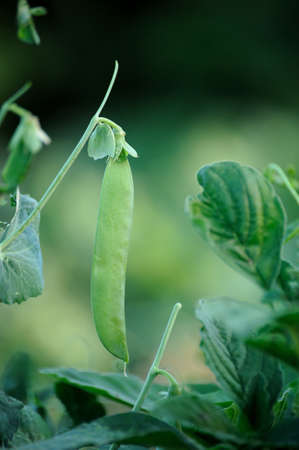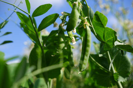 Green peas growing in the garden. Selective focus. Shallow depth of field