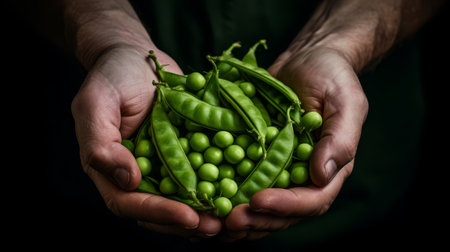 Farmer’s hands holding fresh organic peas, focus on the freshness, minimalist