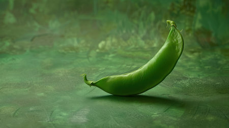A single, plump pea pod rests on a smooth, green surface, its vibrant green color contrasting with the soft, blurred background. The pod's shape curves gracefully, creating a sense of delicate beauty and simple elegance.