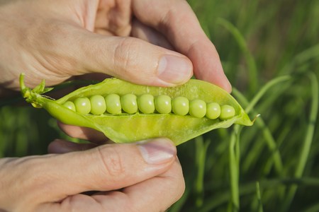 Mens hands hold one pea pod and cracking it in garden, summer time