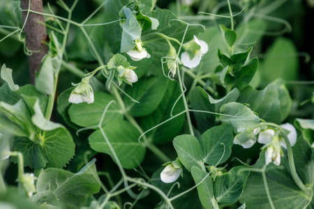 Pisum sativum, pea, garden peas in the garden. Young pea sprouts. Pea pod on a bush close-up. Vegetarian food. Growing peas outdoors.