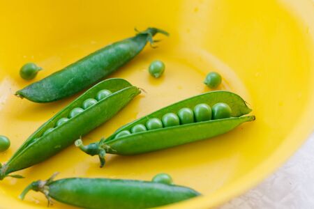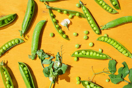 Ripe peas in pods on a yellow wooden background. The concept of summer, pea crop, healthy vitamin food.