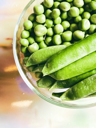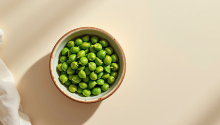 Fresh Green Peas in a Rustic Bowl on a Light Background with Soft Shadows and Natural Light, Perfect for Healthy Eating and Cooking Inspiration