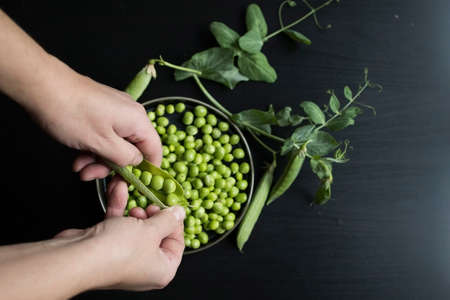 Preparation and processing of harvested homemade organic green peas in pods and shelled