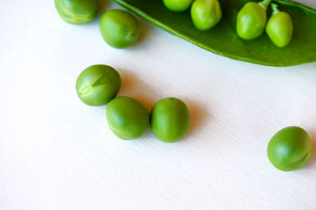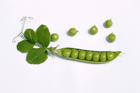 A few grains of green peas on a white background, a leaf and a pod with exposed seeds.