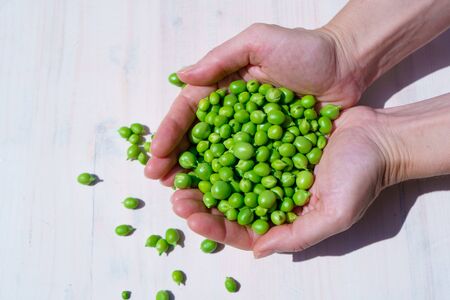 Woman's hands holding a handful of freshly picked peas outdoors in the rays of the sun