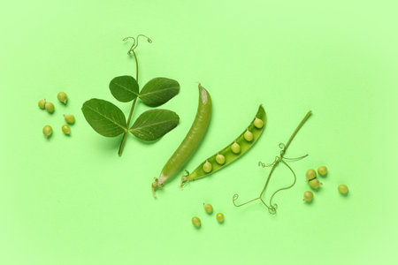 Two opened green pea pods, each containing several peas, are arranged on a light green background with shadows.
