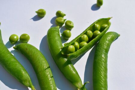 Open pod with peas inside. Green peas in a pod on a white background. Green pea pods on a white background.