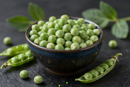 Fresh green peas in a bowl on a dark background. Healthy food.