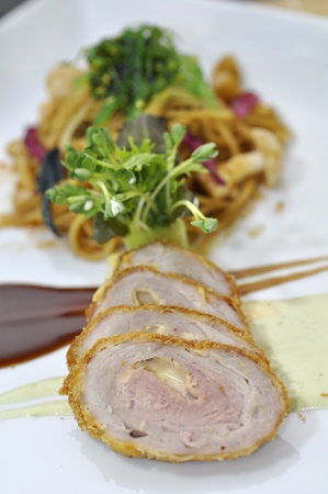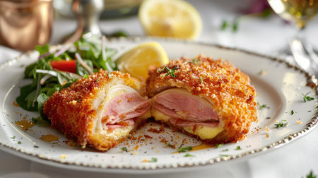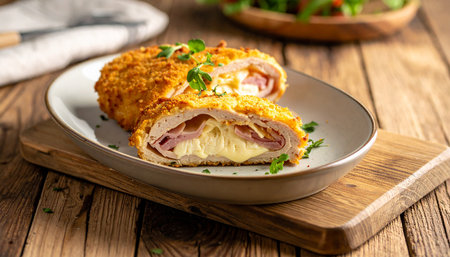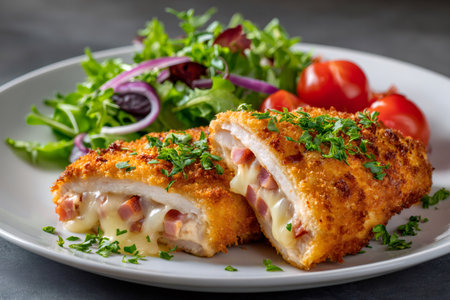 Golden chicken cordon bleu served with fresh greens and cherry tomatoes