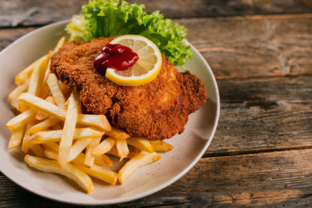 Crispy Fried Chicken Schnitzel with French Fries and Lemon Garnish on Rustic Wooden Table