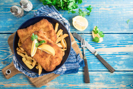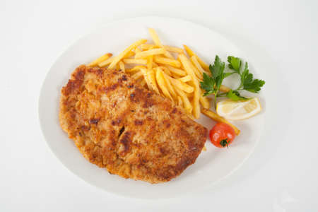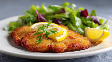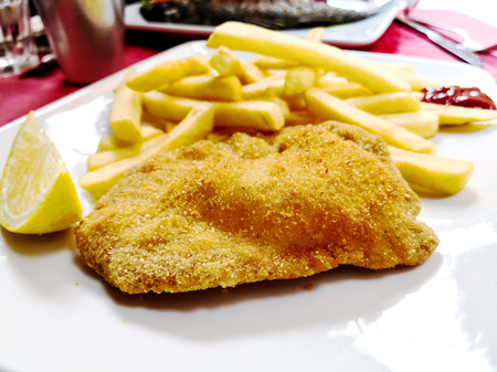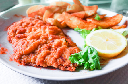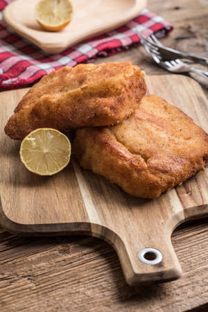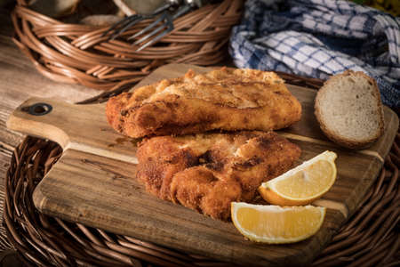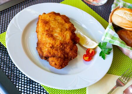 Appetizing Ljubljana steak - fried breaded pork steak served with fresh lemon slice. Slovenian cuisine