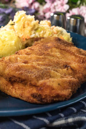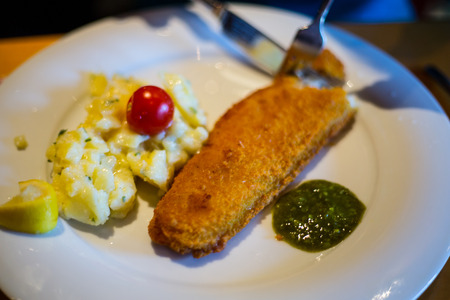 Breaded fish with potato and salad of sauerkraut for dinner. Selective focus.