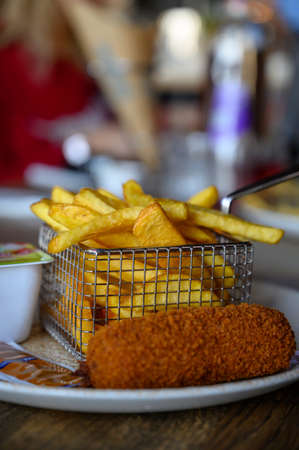 Traditional Dutch fast food snacks, fricandel and french fried potato chips, unhealthy food
