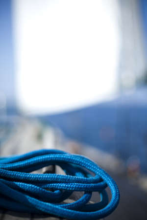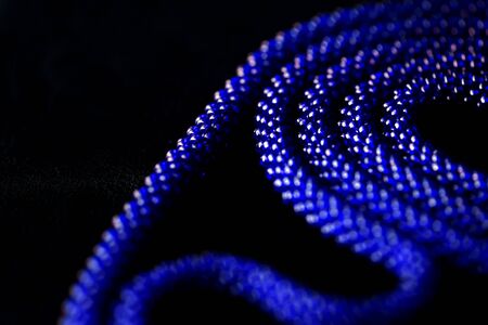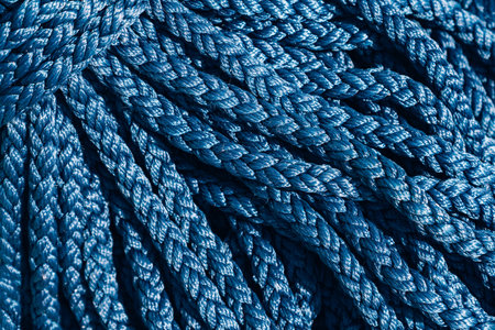 Objects, connection, strength, sailing equipment concept. Detailed closeup of thick blue rope in sunlight
