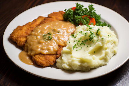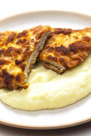 Schnitzel with mashed potatoes on a plate in a restaurant
