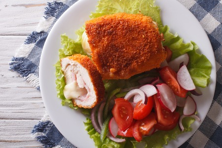 Delicious sliced Chicken cordon cheese and a salad on a plate close-up. horizontal top view