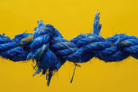 Close-up of dark blue and yellow rope, symbolizing the theme 'Raveling' for an online video series about building bridges between different paths in life. The background is a deep navy color to create focus on the ropes, creating depth and contrast. --chaos 30 --ar 16:9 --v 6.1 Job ID: f662f84c-2669-4c74-b8d4-406733ad80a9