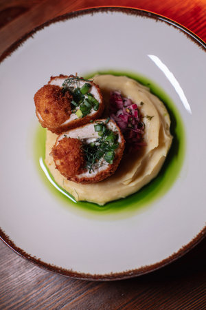Cutlets with airy mashed potatoes served in the restaurant. The perfect photo for a menu, culinary blog, or an advertisement for catering establishments.