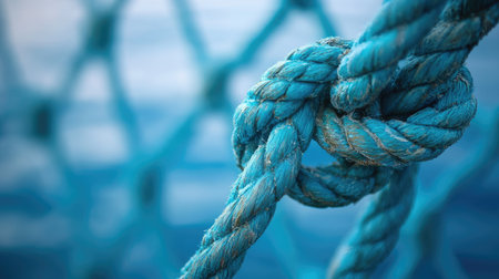 A striking close-up of a vibrant blue nautical knot, showcasing intricate detail and texture. The soft blue water background enhances the rustic charm and marine aesthetics, perfect for arts, crafts, and thematic projects related to the sea and outdoor adventures.