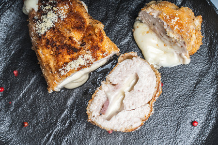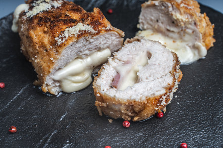 Cordon Bleu chicken cutlet with bacon and cheese on a plate. Close-up. Top view. High quality photo