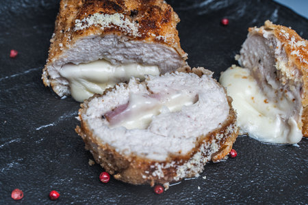 Cordon Bleu chicken cutlet with bacon and cheese on a black plate. Close-up. High quality photo