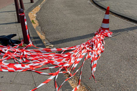 Warning tape, passage is prohibited concept. Red and white stripes caution tape. Coronavirus COVID 19 testing area
