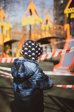 Portrait of sad caucasian child in face mask on closed playground outdoor. Coronavirus social distance.
