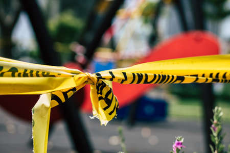 children's games cordoned off with yellow tape Forbidden due to pandemic, new normal
