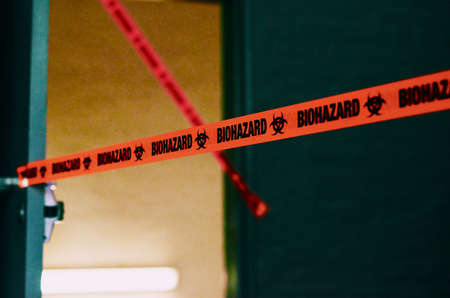 Warning, tape and caution, biohazard and health, infection and barrier with bokeh, blurred background and science. danger, biology and threat with medical crisis, safety with protection and toxic