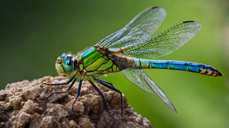 Closeup of a dragonfly with blue and yellow wings on a green background. Macro photography of insect with detailed texture. Concept of nature, beauty, and fragility.