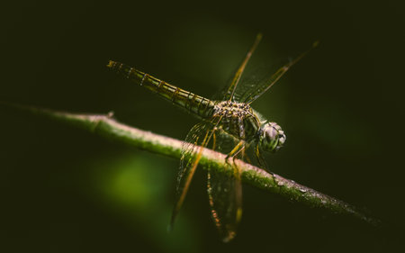 Dragonfly Perch Against Blurry Background Elongated Wings, Colorful Body, Large Eyes Amidst Bokeh Effects