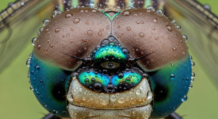This detailed macro shot captures the intricate hexagonal facets of a dragonfly's large compound eyes, shimmering with rainbow colors and dotted with tiny water droplets