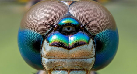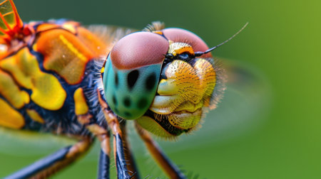 This stunning macro shot captures the intricate features and vivid colors of a dragonfly's head, revealing its unique beauty against a soft green backdrop.