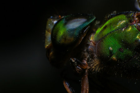 Macro shot of a dragonfly with green eyes on a black background