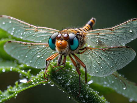 Vibrant dragonfly perching on a wet green leaf in spring time generated by artificial intelligence