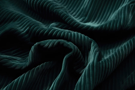 Deep emerald green corduroy fabric draped in soft folds, showcasing thick, velvety ridges. ideal for textile design, fashion backgrounds, and luxurious texture concepts.